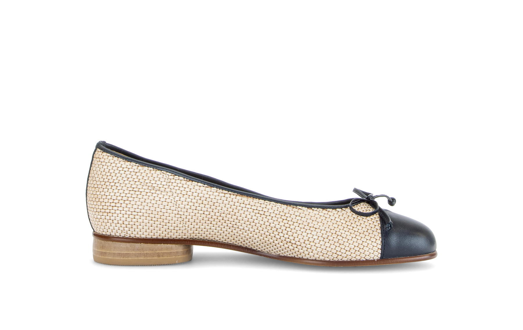 Slip-on shoe in cream weave leather and navy leather with bow detail