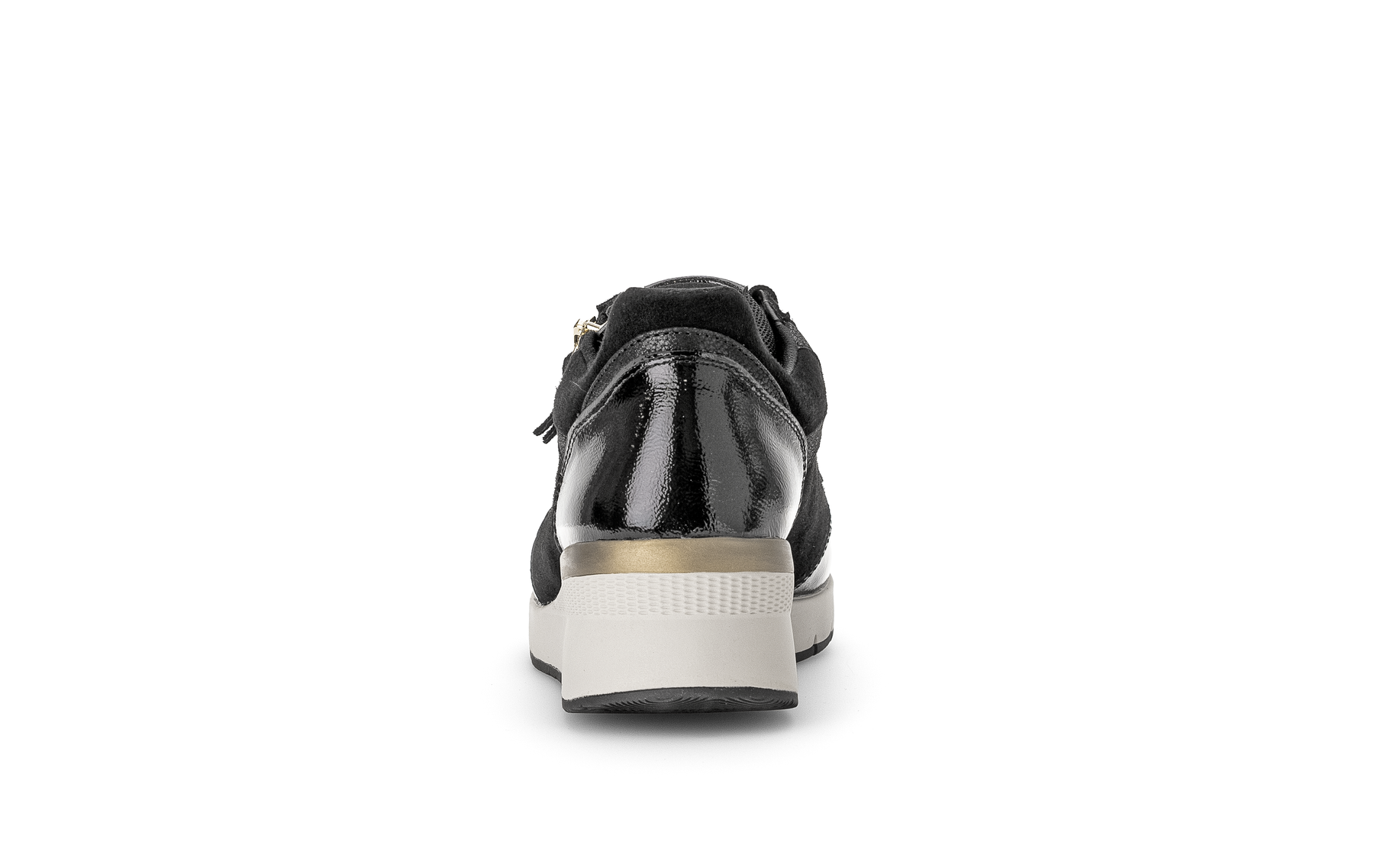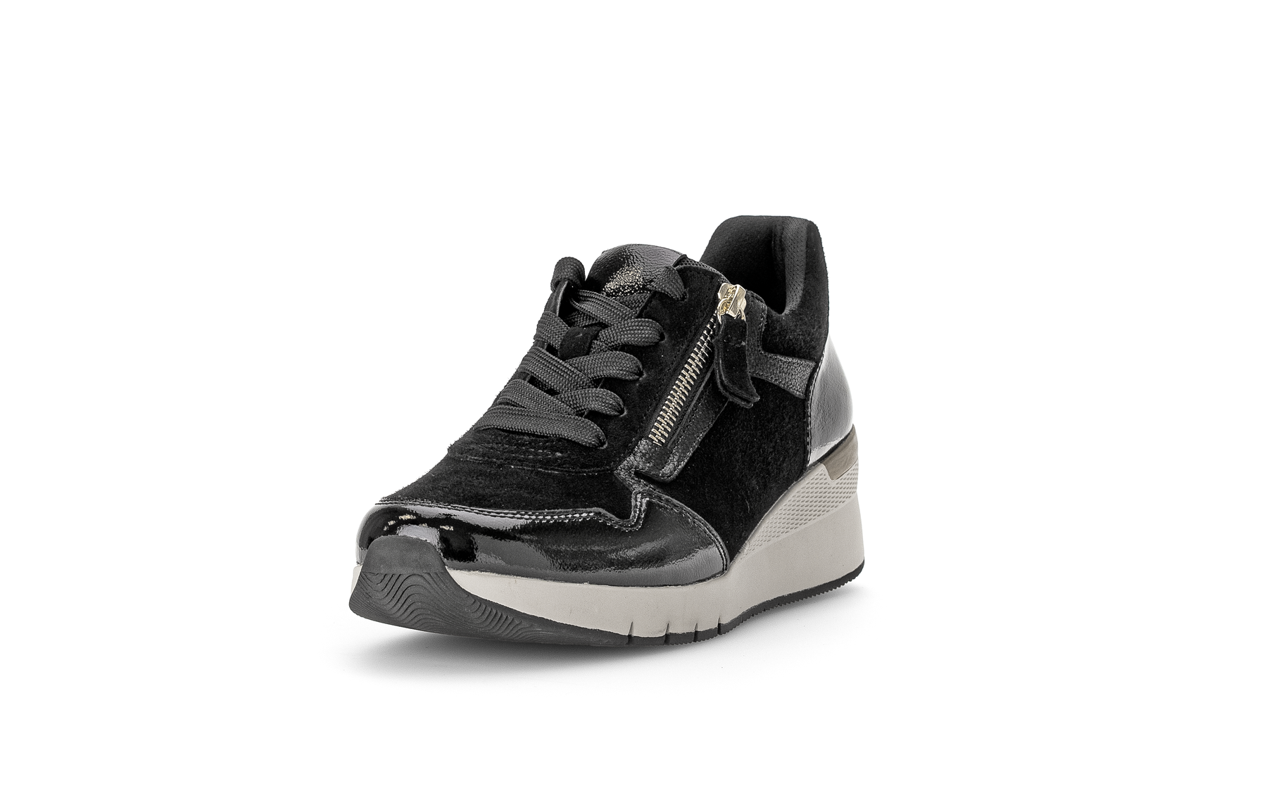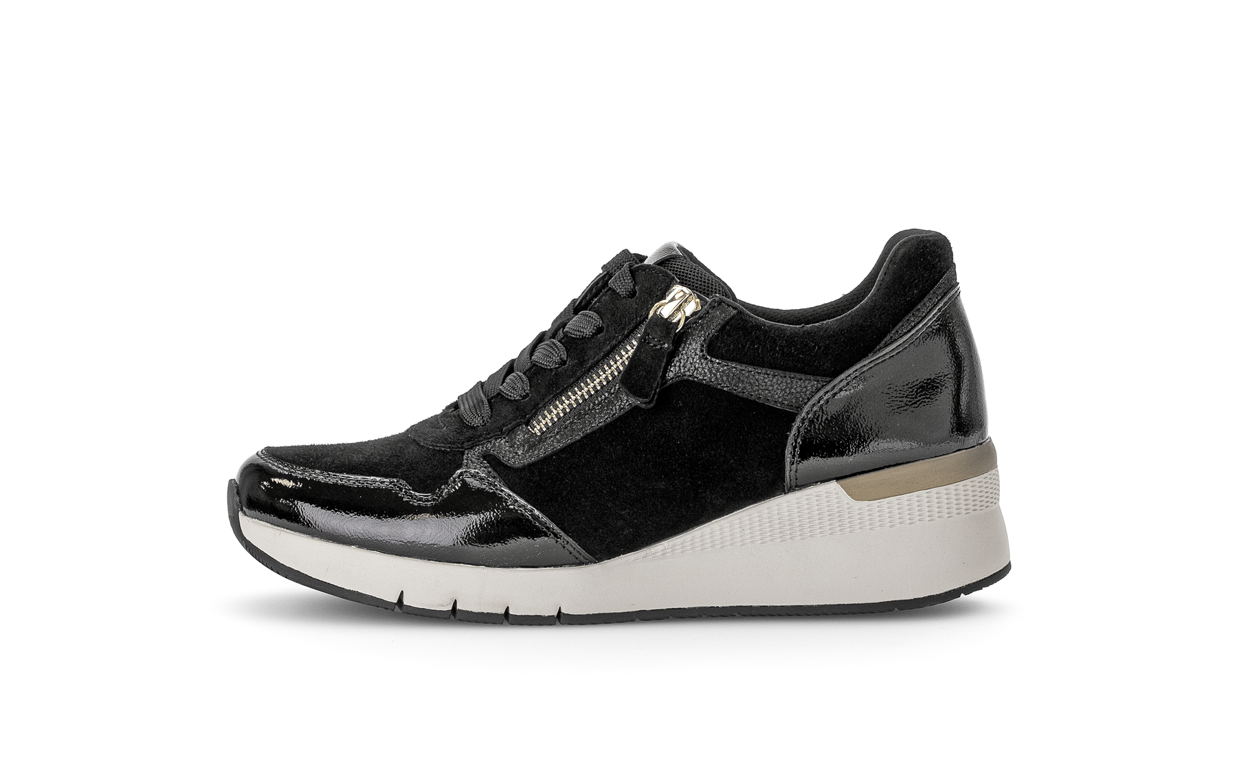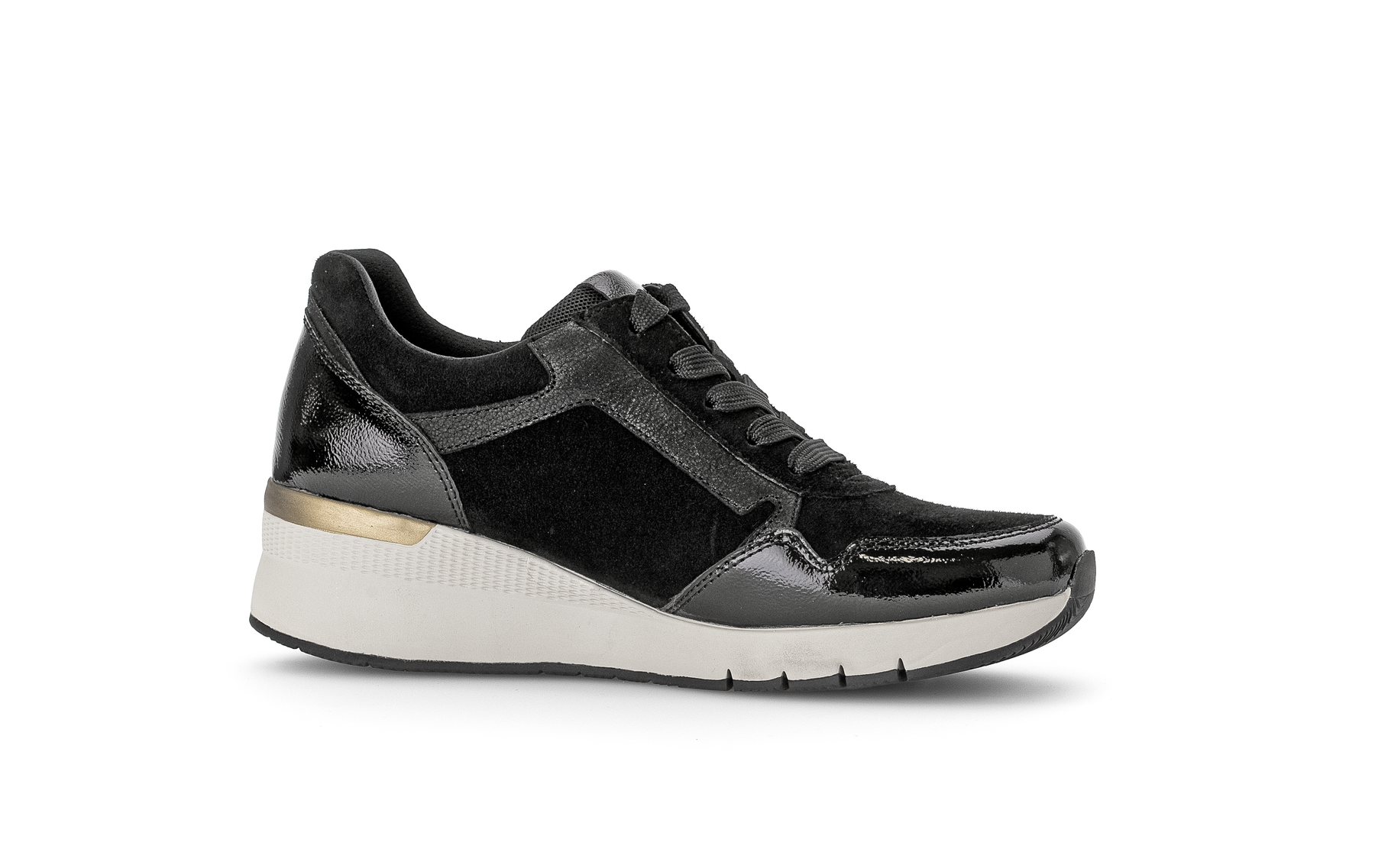 Comfort wedge shoe in black suede and black patent mix with gold detailing