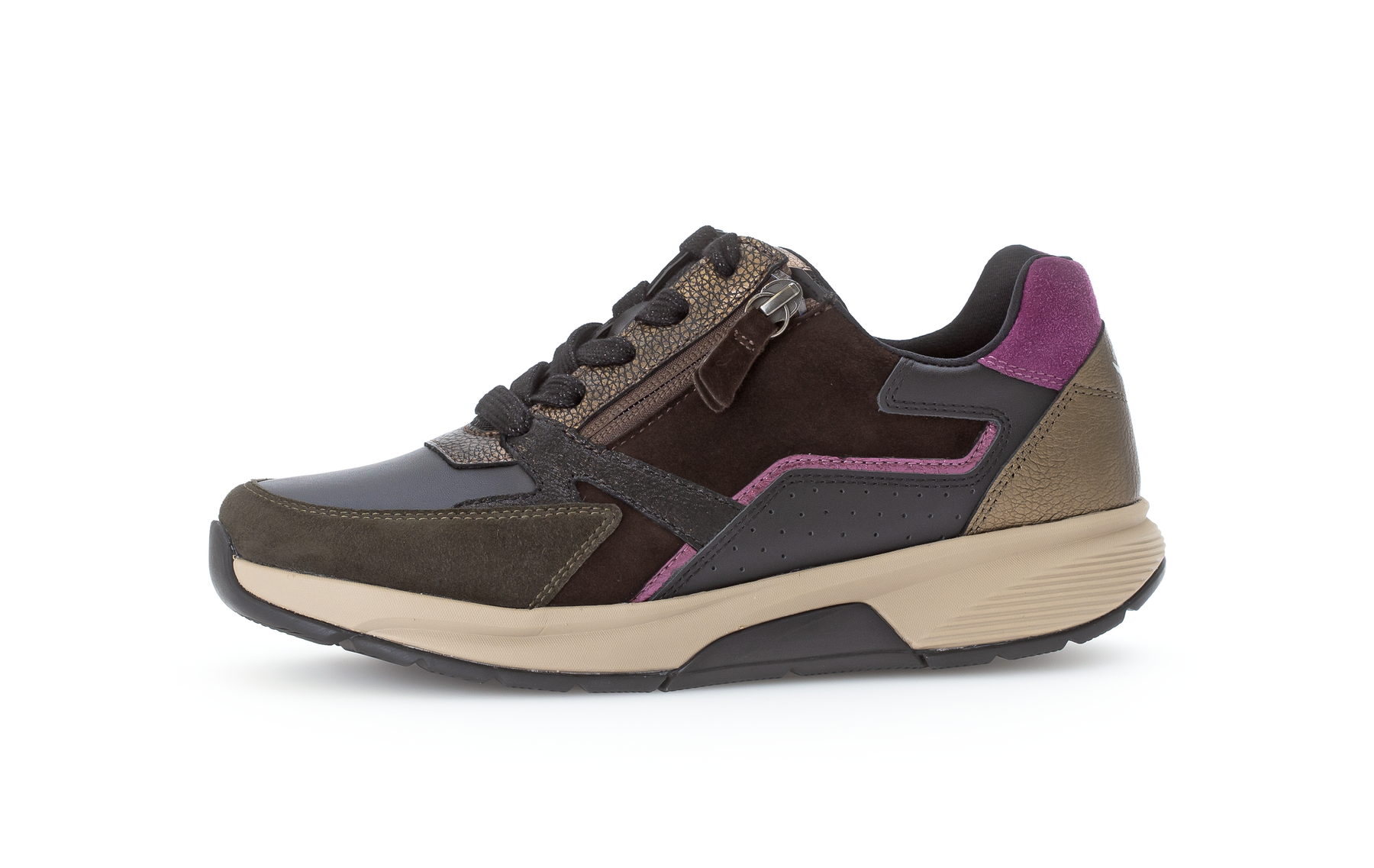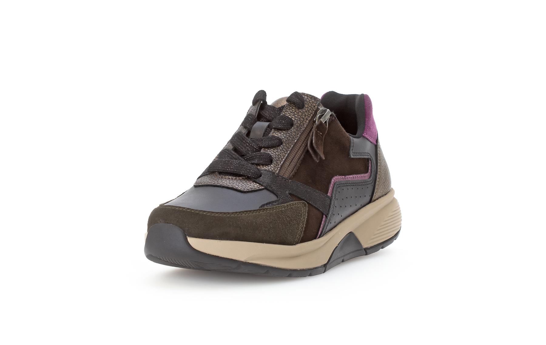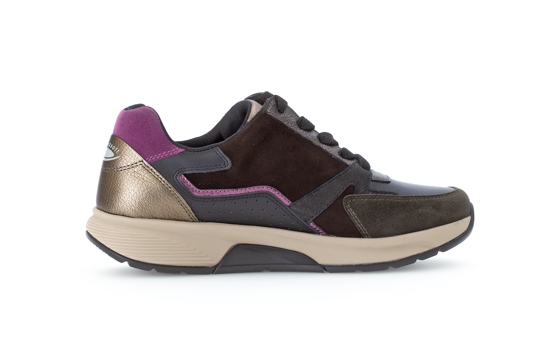 Supportive comfort shoe in mix of black, brown and berry